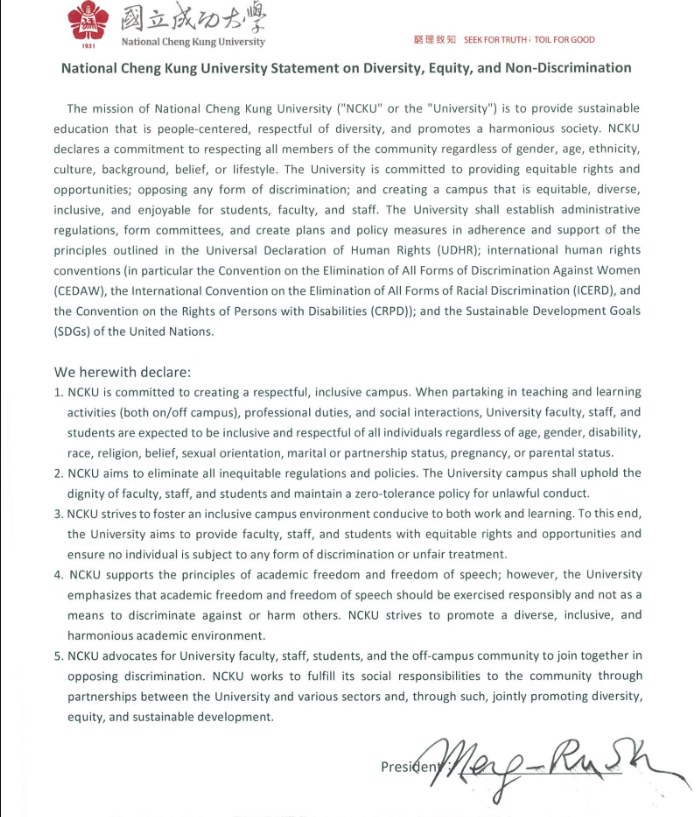 - National Cheng Kung University Statement on Diversity, Equity, and Non-Discrimination