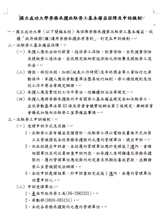 - Basic Rights Protection and Complaint Mechanism for Contracted and Assigned Workers at National Cheng Kung University