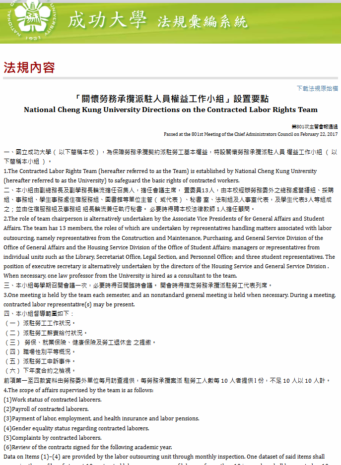 - National Cheng Kung University Directions on the Contracted Labor Rights Team