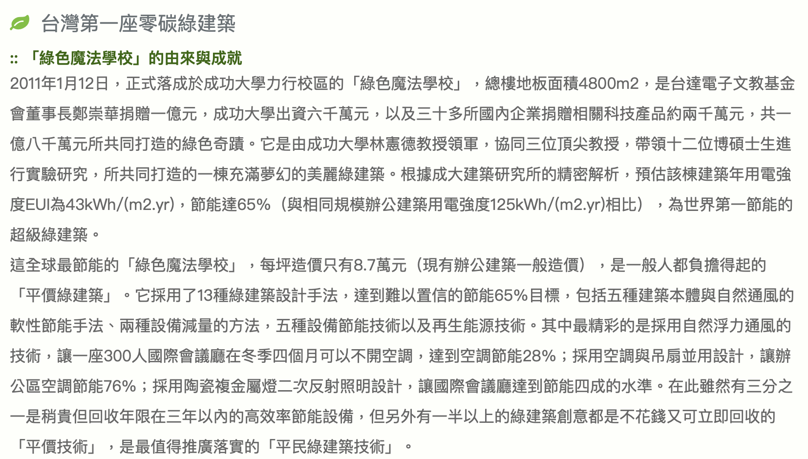 NCKU’s “Magic School of Green Technologies”, completed in 2011, is Taiwan’s first zero-carbon green building, with a total floor area of 4,800 square meters. It was jointly funded by the university and industry partners. Designed by Professor Hsien-Te Lin’s team, the building incorporates 13 green building strategies and renewable energy technologies, achieving a 65% energy-saving effect. Its annual energy use intensity is only 43 kWh/(㎡·yr), far lower than the 125 kWh/(㎡·yr) of comparable buildings. Key features include natural buoyancy ventilation, energy-efficient air conditioning, and lighting design, enabling a 300-person conference hall to operate in winter without air conditioning and reducing public space energy consumption by 76%. Recognized as one of the world’s most energy-efficient buildings, it also embodies the concept of “affordable green building” with a construction cost of only NT$87,000 per ping, demonstrating a sustainable model that is both high-performing and cost-effective.- 【Video】Digital Innovation and Sustainable Health: Building a Smart and Livable Future City — Vice President Ching-Te Lai Attends the Groundbreaking Ceremony of NCKU Shalun Hospital (Smart Green Building)
