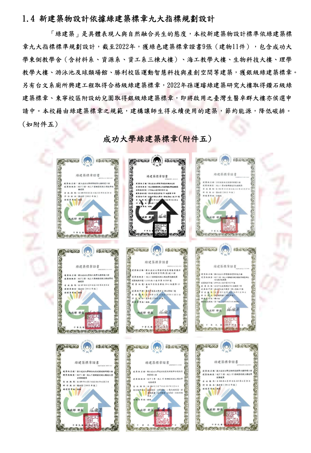 The university’s new buildings are planned and designed according to the nine major indicators of green architecture. By 2022, it had obtained nine Green Building Label certificates (covering 11 buildings), including the College of Power Engineering, the Ocean Engineering Building, the Biotechnology Building, the College of Science Teaching Building, the swimming pool and sports facilities, and the Victory Campus Smart Sports Technology and Innovation Space. Additional projects, such as the Department of Taiwanese Literature restrooms, the Sun Yun-suan Green Building Research Hall, and the Dongning Campus Kindergarten, have also received various levels of green building certification. NCKU emphasizes that these buildings were designed with sustainability as a guiding principle, implementing energy-saving, water-conservation, and waste-reduction strategies to realize a development blueprint for an environmentally friendly campus.- Energy-Saving Campus Zone