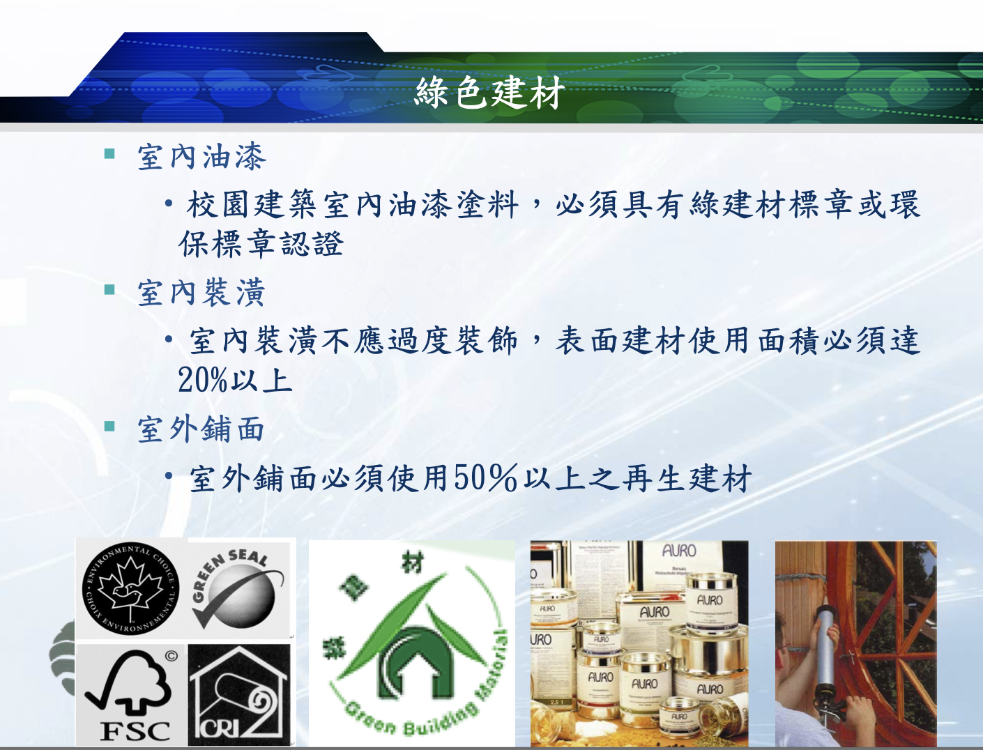 To promote the use of green building materials in campus construction, interior paints must carry a Green Building Material Label or eco-label certification to ensure environmental and health safety. Interior decoration should avoid excessive design, and surface building materials must account for at least 20% to reduce resource waste. For outdoor paving, at least 50% must use recycled materials to achieve circular reuse. This policy not only complies with green building standards but also demonstrates NCKU’s commitment to implementing sustainability principles and environmental responsibility in campus development, creating an energy-efficient and low-carbon campus environment.