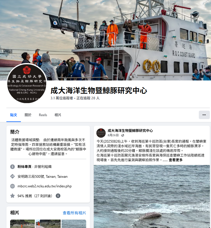 2. The NCKU Marine Biology and Cetacean Research Center is dedicated to the rescue of stranded whales and dolphins, subsequent care, and related research. Its goal is to recruit more volunteers for rescue efforts and to raise public awareness about whale and dolphin conservation, working together to protect marine ecosystems.