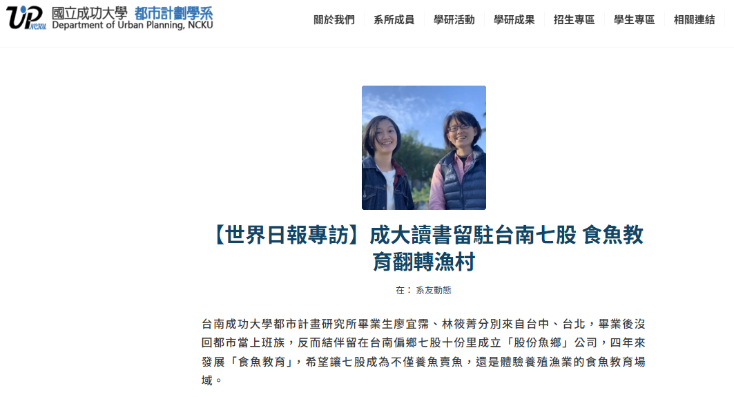 - Cofishland, a Local Fish Education Organization founded by NCKU's Urban Planning doctoral students