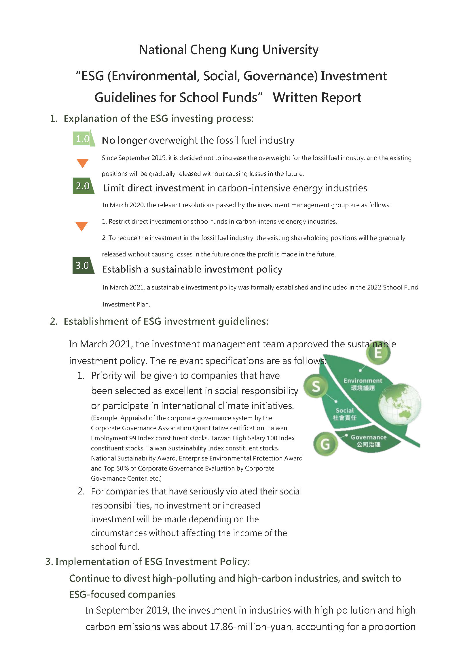 - NCKU ESG (Environmental, Social, Governance) Investment Guidelines for School Funds” Written Report