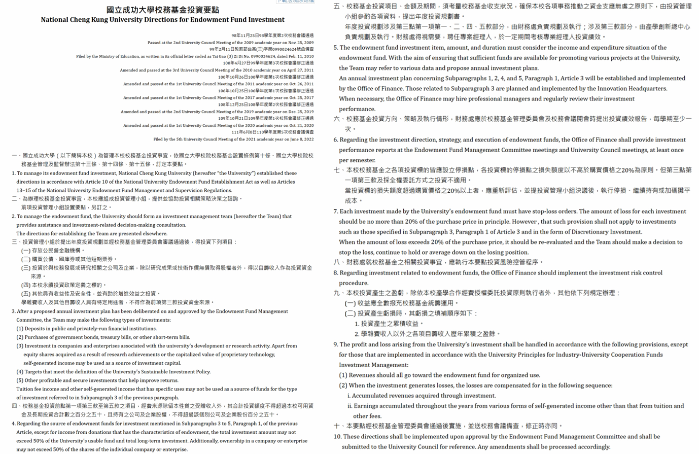 - NCKU Directions for Endowment Fund Investment