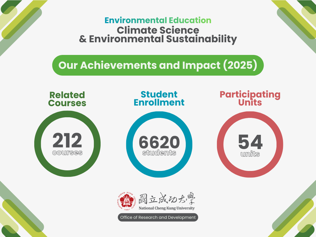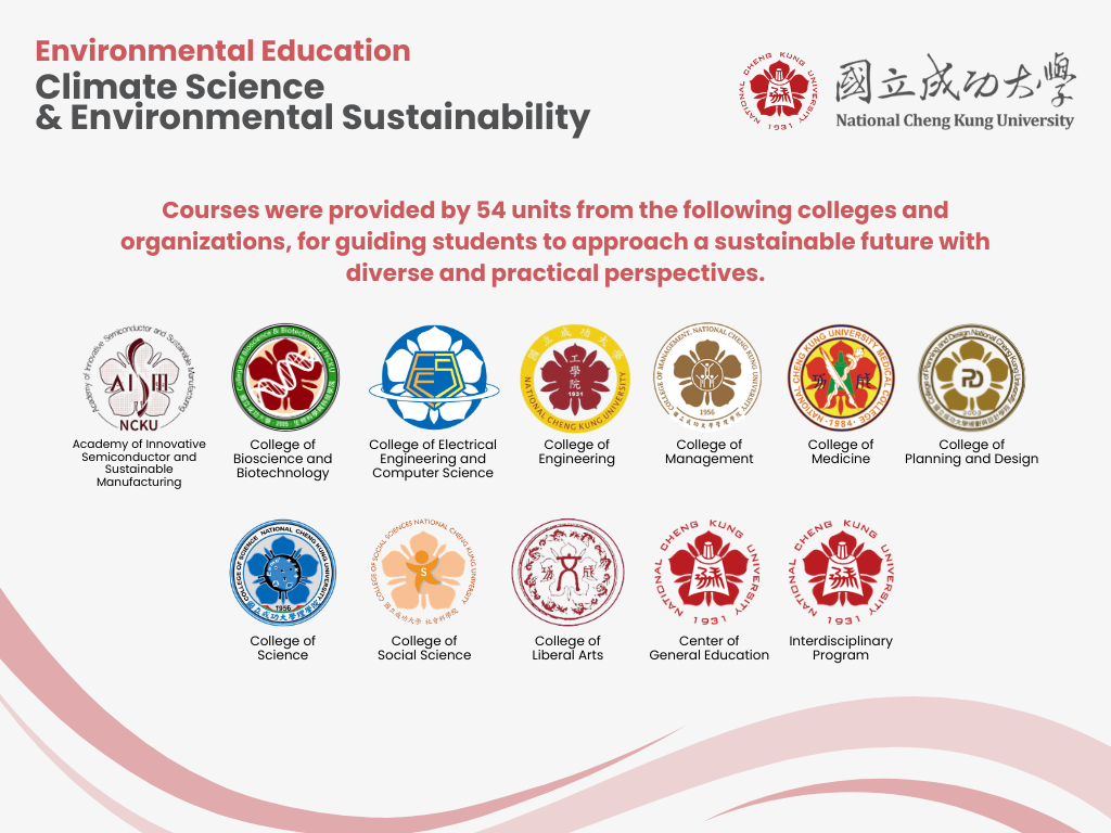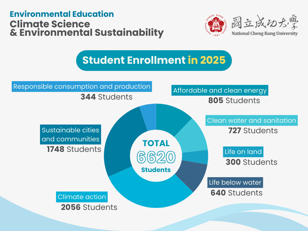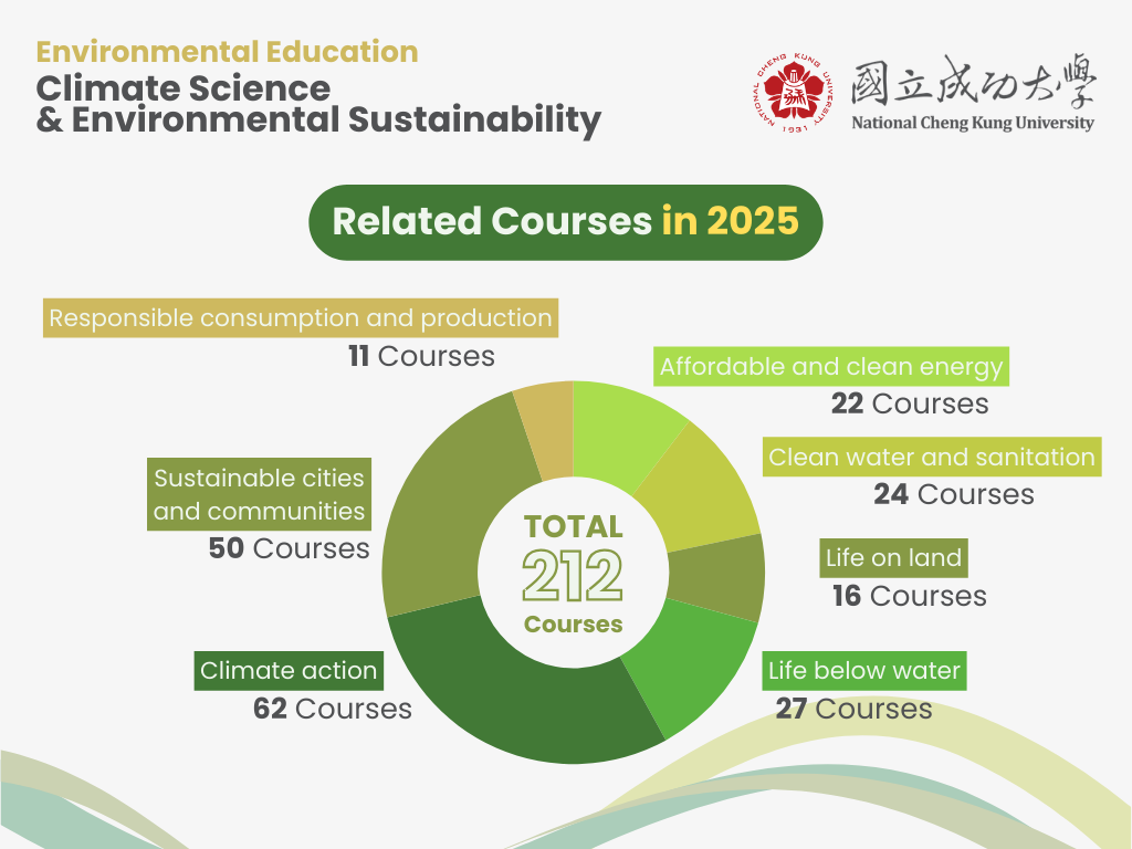 In 2025, NCKU offered 212 courses related to climate science and sustainability, with a total of 6,620 student enrollments. These courses were provided by 54 departments and specialized programs across various colleges, including the College of Engineering and the College of Medicine. The university encourages students to deepen their expertise while also promoting interdisciplinary learning through the General Education Center and cross-field programs, enabling students from different disciplines to contribute collectively to a sustainable future.