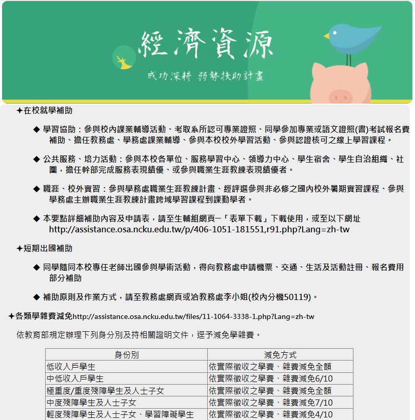 - NCKU has established a Resource Classroom to provide professional support in accordance with the Special Education Act, helping students adapt to the learning environment while enhancing communication with parents, faculty, and administrative units.