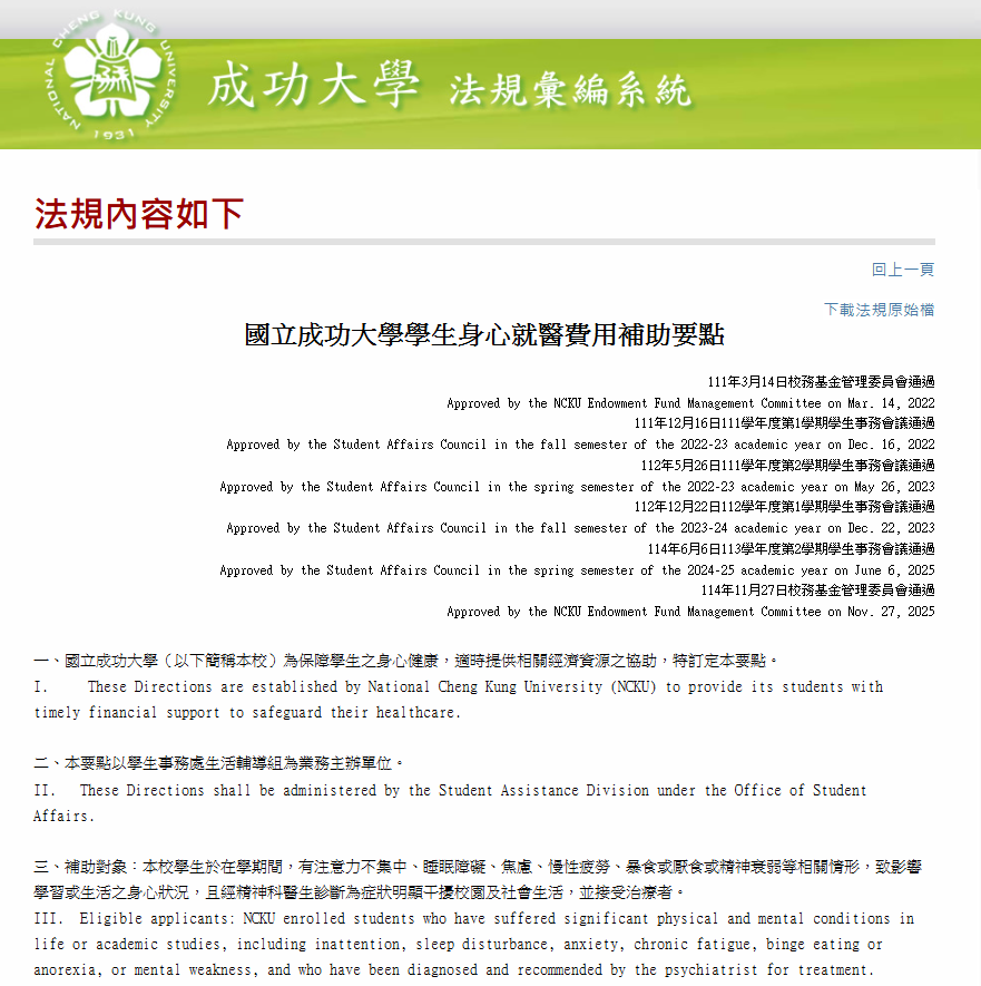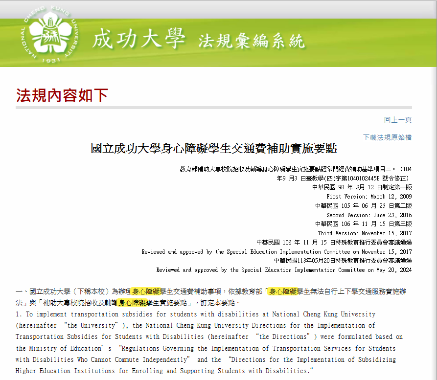 National Cheng Kung University (NCKU) upholds the principles of equality and inclusion. In compliance with relevant regulations, the university has established reasonable accommodation policies and support strategies for students and faculty with disabilities. By allocating sufficient funding, NCKU provides comprehensive services covering education, daily life, healthcare, and employment, ensuring a supportive and accessible environment for learning and working.