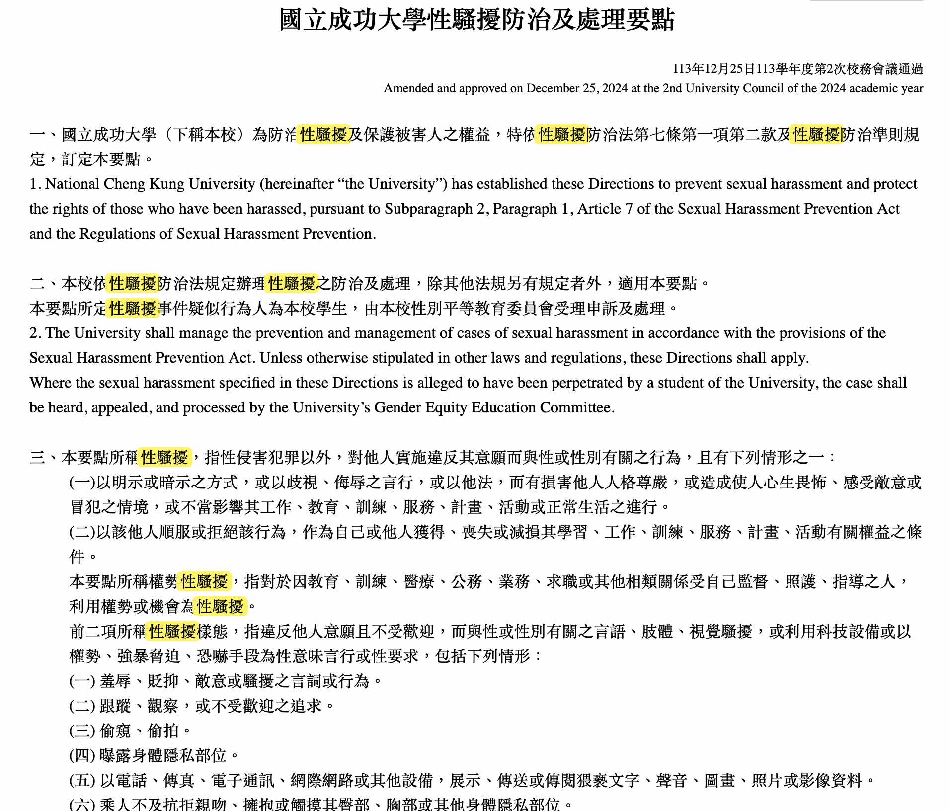- NCKU Regulations on the Prevention and Handling of Campus Gender-Related Incidents