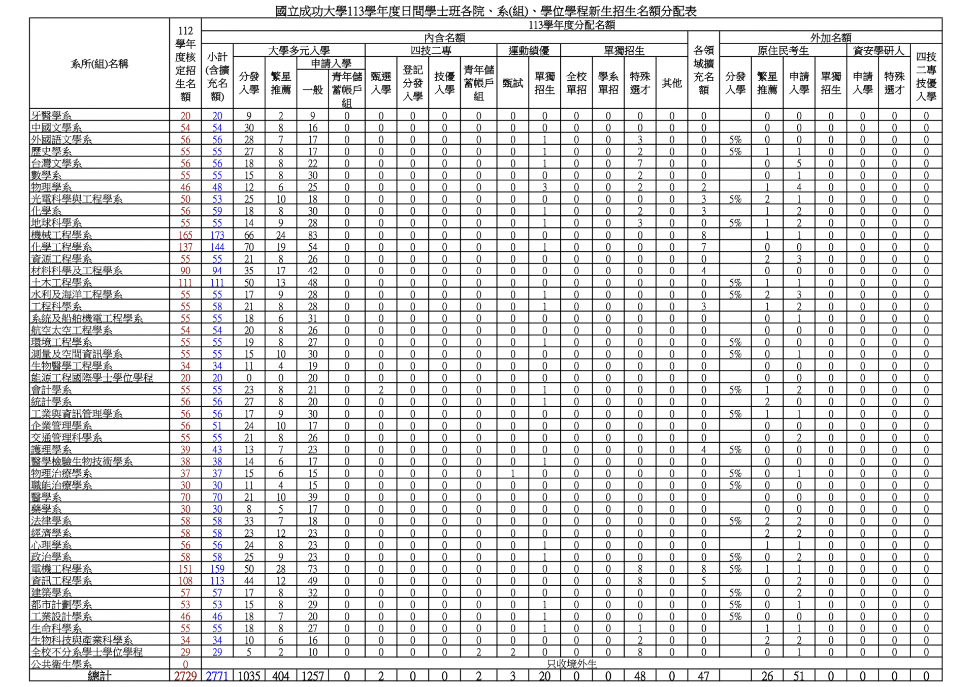 NCKU regularly publishes gender statistics for all students and staff, providing data on gender ratios across academic levels and colleges. For example, in the first semester of the 2024–2025 academic year, the total student population was 23,381, with 14,549 male students and 8,832 female students, resulting in a male-to-female ratio of approximately 1.65:1. The university further disaggregates gender ratios for doctoral, master’s, and undergraduate programs, as well as for each college (e.g., Humanities, Sciences, Engineering, Medicine). These publicly available data enable the tracking of gender participation at different levels of higher education, demonstrating NCKU’s commitment to gender equality and transparency, while also providing important references for external evaluation of the university’s gender composition.- Allocation of Undergraduate Admission Quotas by Department in Previous Years (Indigenous Student Quotas)
