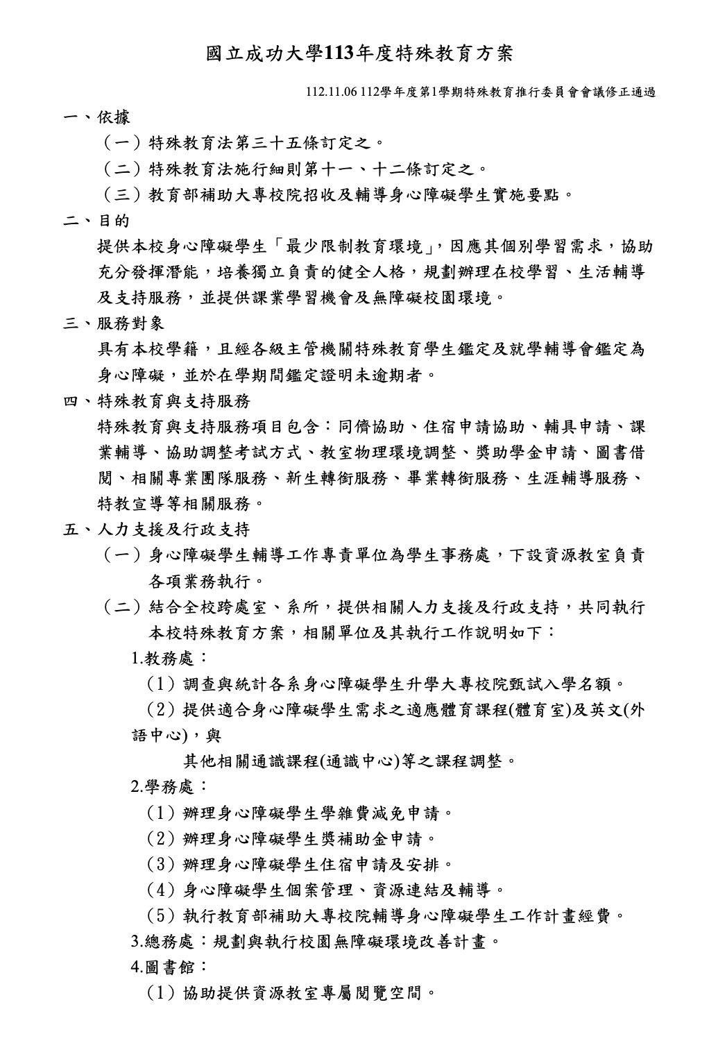 In accordance with the Special Education Act and Ministry of Education regulations, the university provides a “least restrictive educational environment” for students with disabilities, supporting both academic success and daily life adaptation. Eligible students are those officially enrolled and certified as having disabilities by the competent authorities. Support services include peer assistance, housing and academic tutoring, exam and classroom adjustments, scholarship applications, library borrowing privileges, career and life counseling, and transition services for new students. The program is administered by the Office of Student Affairs Resource Room, in collaboration with various university offices to provide administrative and human resources support—such as curriculum adjustments by the Academic Affairs Office, subsidies and housing arrangements by the Student Affairs Office, accessibility improvements by the General Affairs Office, and library support for accessible reading spaces.