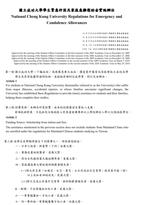 The NCKU Disadvantaged Students Assistance Platform provides a variety of financial support and counseling services, providing the resources and funds needed for counseling for economically disadvantaged students, and helping economically disadvantaged students to study smoothly.- NCKU Regulations on Student Gift Aid