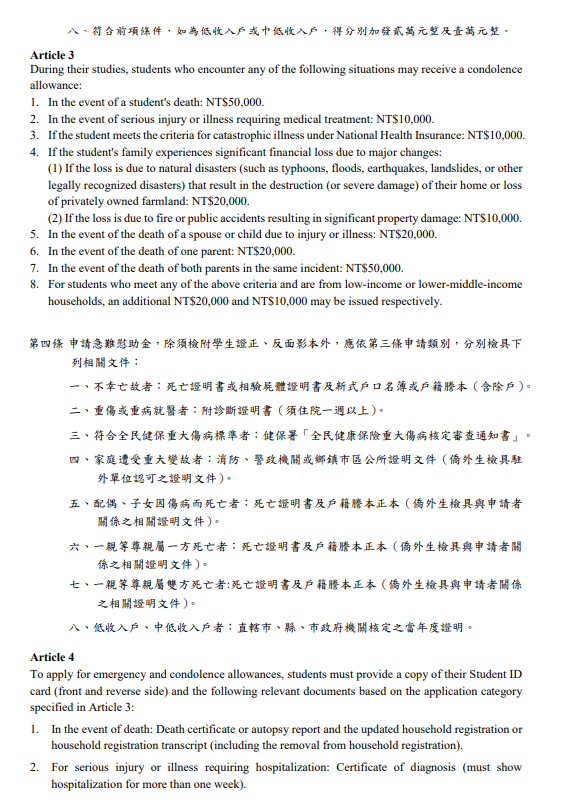 NCKU Banyan Garden Dream Fulfillment Scholarship Network shows a variety of financial assistance programs—including scholarships, emergency relief, support for disadvantaged students, student loans, and tuition/fee subsidies—to help reduce the financial burden on underprivileged students- NCKU Regulations for Emergency and Condolence Allowances