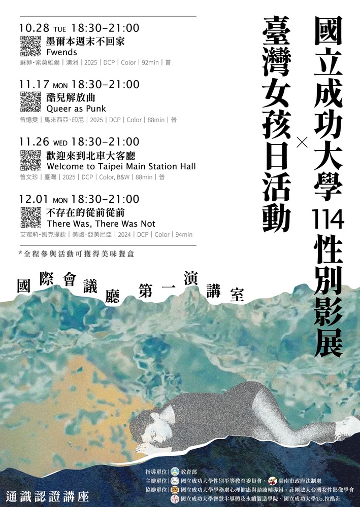 The event is funded by the Ministry of Education under the 114th Taiwan Girls’ Day program and organized by NCKU’s Gender Equality Education Committee in collaboration with the Tainan City Government Legal Affairs Department, NCKU Counseling and Psychological Services, and NCKU College of Intelligent Semiconductors and Sustainable Manufacturing. The four featured films are: Fwends (墨爾本周末不回家), Queer as Punk (酷兒解放曲), Welcome to Taipei Main Station Hall (歡迎來到北車大客廳), and There Was, There Was Not (不存在的從前從前). These films examine the inner lives of contemporary young women, gender equality and LGBTQ+ rights, the experiences of female migrant workers, and women’s resilience amid war and oppression.