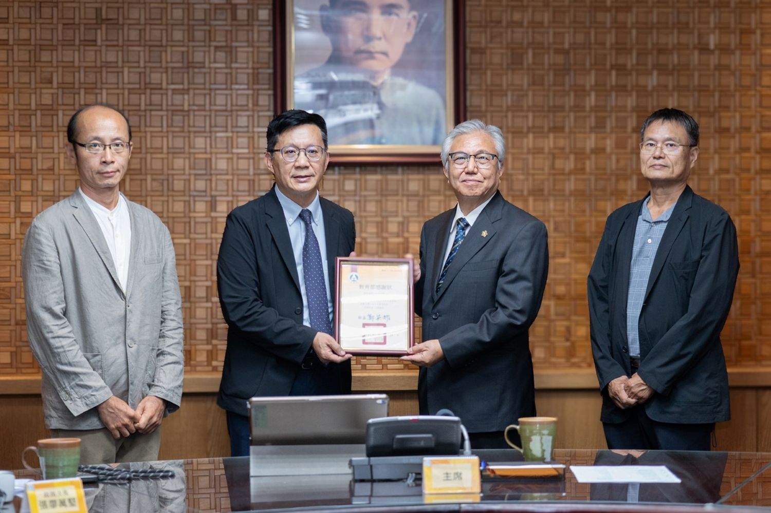 NCKU Vice President Jun-Chang Li (李俊璋) (second from right) accepted a certificate of appreciation from the Ministry of Education on behalf of NCKU.