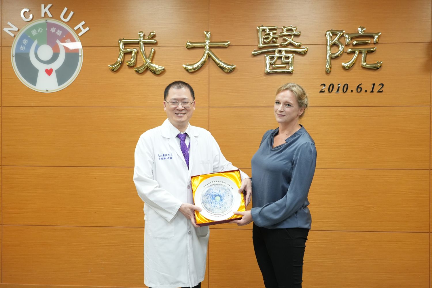 Dr. Jing-Wei Lee(left), President of National Cheng Kung University Hospital presents a gift to Ms. Helena Reitberger.