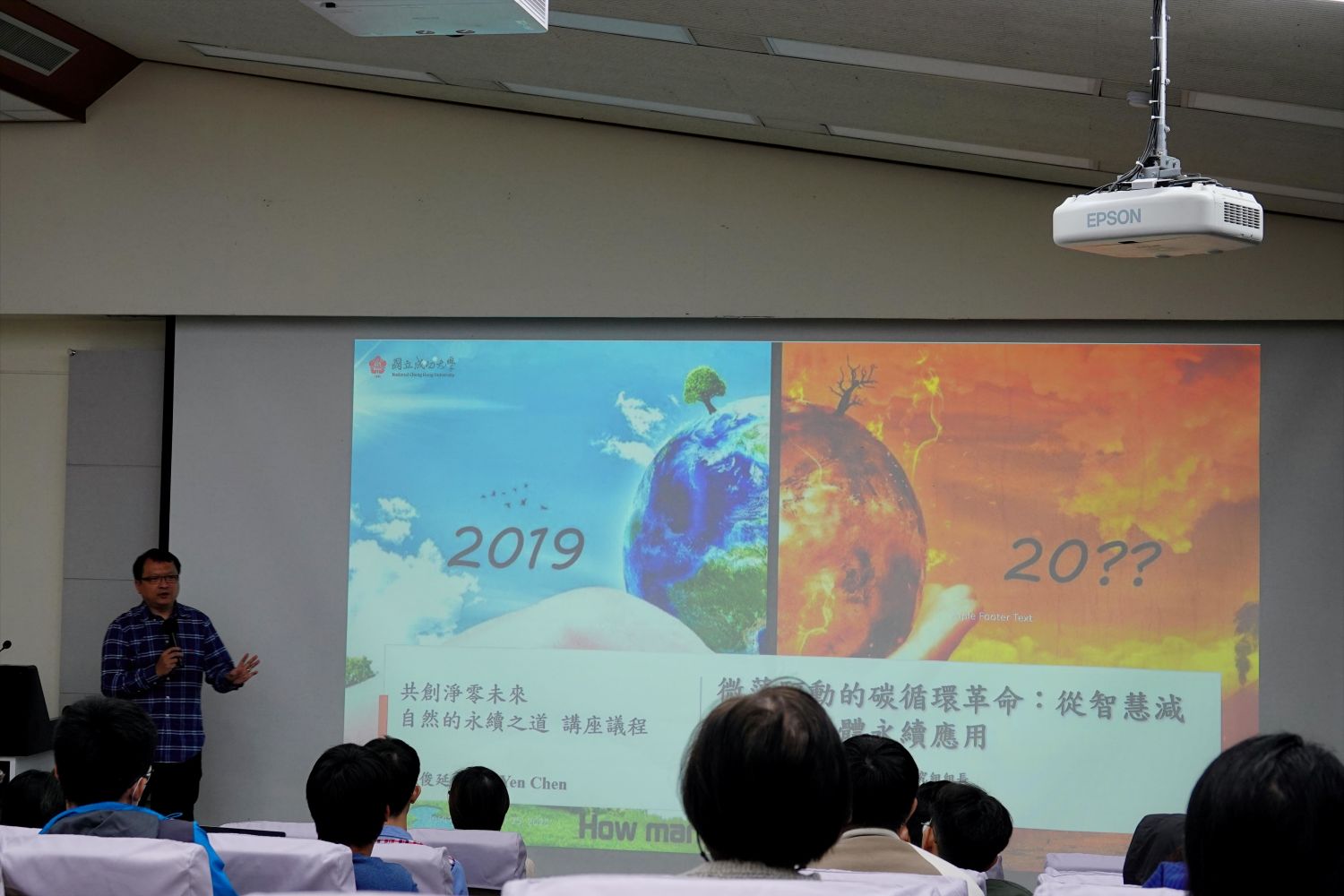 The lecture featured three distinguished speakers: Assistant Professor Ting-Chia Ou (歐庭嘉) of the Intelligent and Sustainable Manufacturing Program, NCKU; Researcher Jun-Yan Chen (陳俊延) from the NCKU Biotechnology Center; and Distinguished Professor Hsing-Lu Lin (林幸助) of the Department of Life Sciences, National Chung Hsing University (NCHU). They provided in-depth analysis of Taiwan’s net-zero transition strategies across three dimensions: energy management, microalgae carbon capture technology, and blue carbon ecosystems, attracting numerous faculty and students for exchange and discussion.