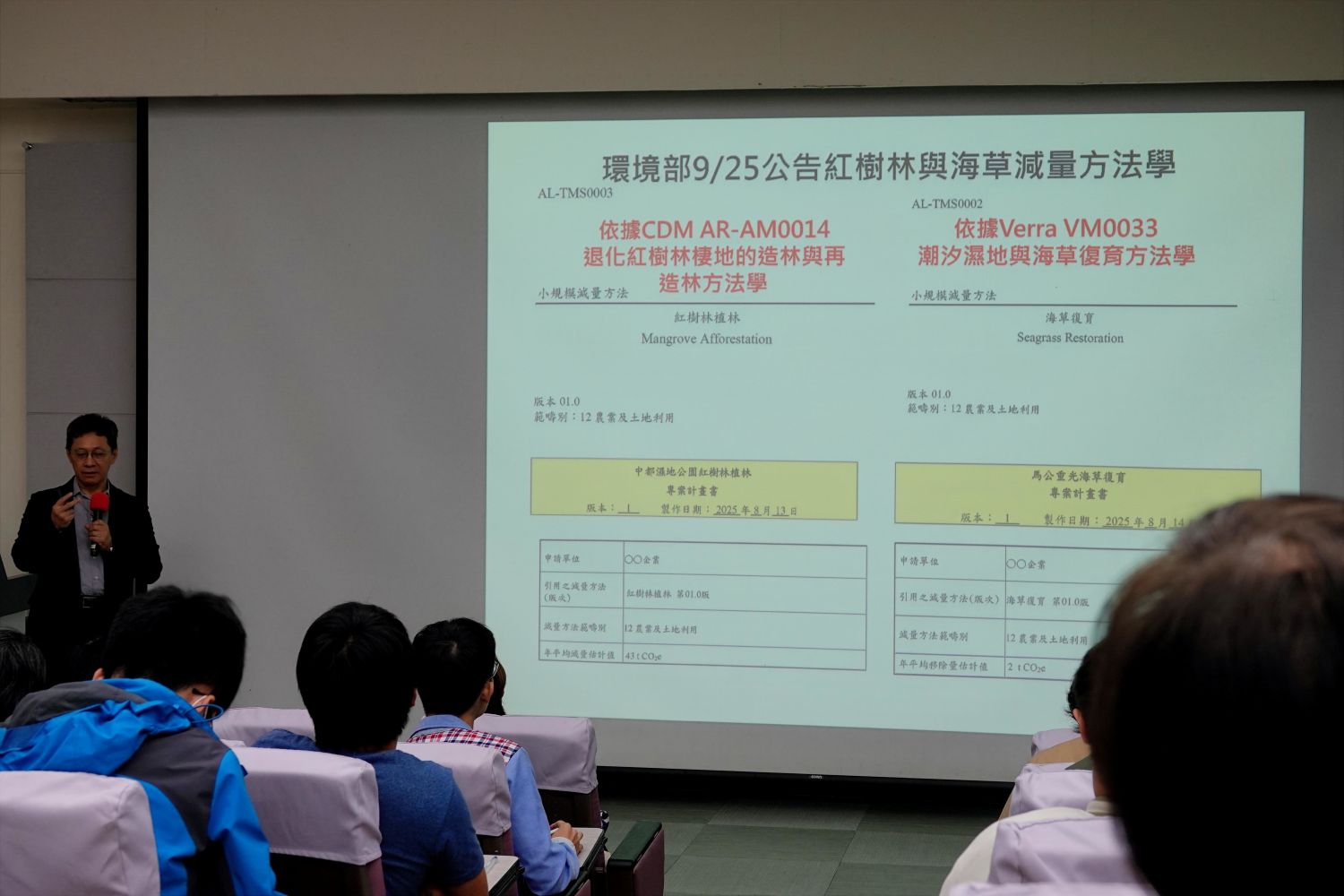 The lecture concluded with Distinguished Professor Hsing-Lu Lin, introduced by Vice Dean Yi-Ching Chen (陳一菁) of the College of Life Sciences, NCHU. Professor Lin, lead author of the IUCN Red List of Mangroves, explained blue carbon ecosystems in detail. He clarified that true blue carbon ecosystems include mangroves, seagrass beds, and tidal salt marshes — which have higher carbon sequestration rates and storage than terrestrial forests (green carbon). He noted that Taiwan has extensive Dongsha Atoll seagrass beds and western coastal mangroves, representing significant carbon sinks. Addressing corporate ESG (Environmental, Social, Governance) needs, Professor Lin advocated for science-based nature solutions, emphasizing that protecting and restoring blue carbon ecosystems not only secures carbon credits but also preserves biodiversity and provides natural disaster mitigation. He called on enterprises to actively participate in blue carbon restoration projects, challenging misconceptions about mangrove destruction and recognizing natural carbon sinks as a priority strategy for mitigating climate change.