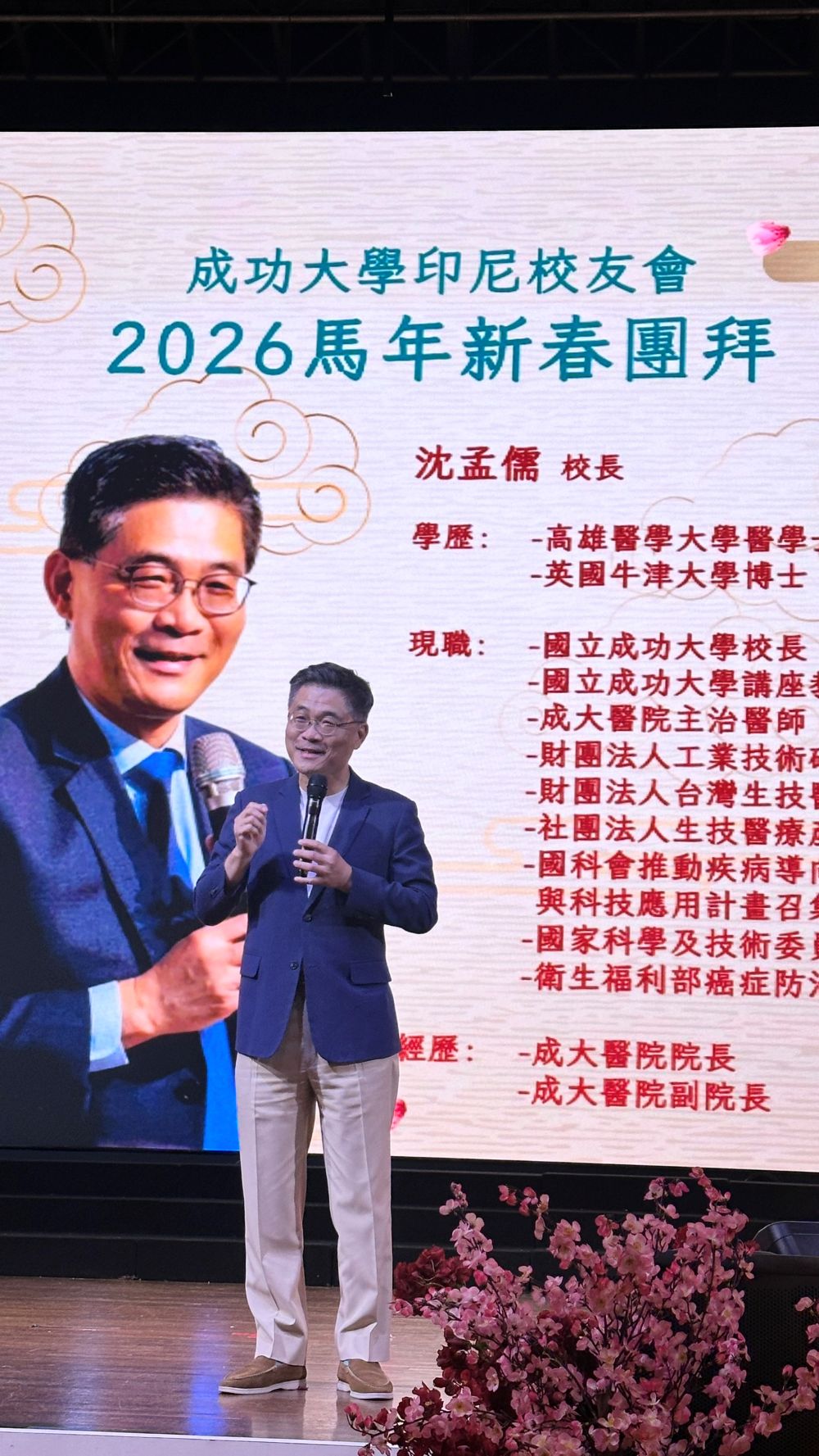 Established in 2014, the NCKU Indonesian Alumni Association is now entering its 12th year. Current association president Fu-Rong Liang (Civil Engineering Class of 1993) first delivered a welcome speech to distinguished guests. In celebration of the Year of the Horse, he extended New Year blessings wishing everyone success and prosperity. He noted that this year’s gathering attracted more than 200 participants, with many alumni traveling from different regions to attend. He expressed hope to further expand future events and strengthen alumni cohesion.