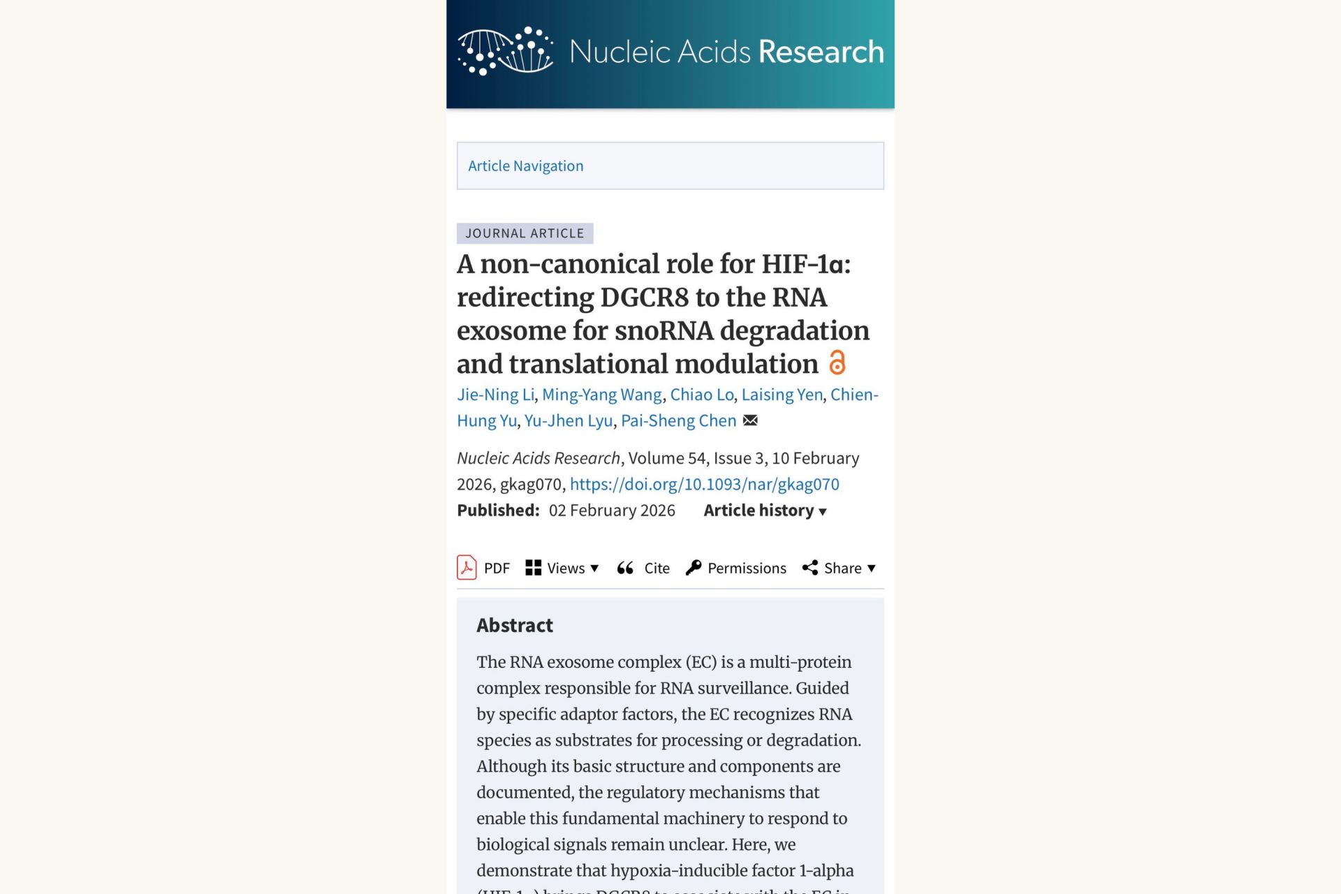 A research team at National Cheng Kung University (NCKU) has uncovered a new mechanism by which the hypoxia-inducible factor-1α (HIF-1α) rewires RNA metabolic pathways in the nucleus, revealing a previously unrecognized strategy used by cancer cells to adapt to hypoxia. The study, led by Dr. Pai-Sheng Chen from the Department of Medical Laboratory Science and Biotechnology at NCKU, was published in the international journal Nucleic Acids Research. The new research reveals that HIF-1α, aside from serving as a transcription factor, can "rewire" RNA metabolic pathways within the nucleus. A non-canonical role for HIF-1α: redirecting DGCR8 to the RNA exosome for snoRNA degradation and translational modulation. (Nucleic Acids Research, 2026). doi: doi.org/10.1093/nar/gkag070.