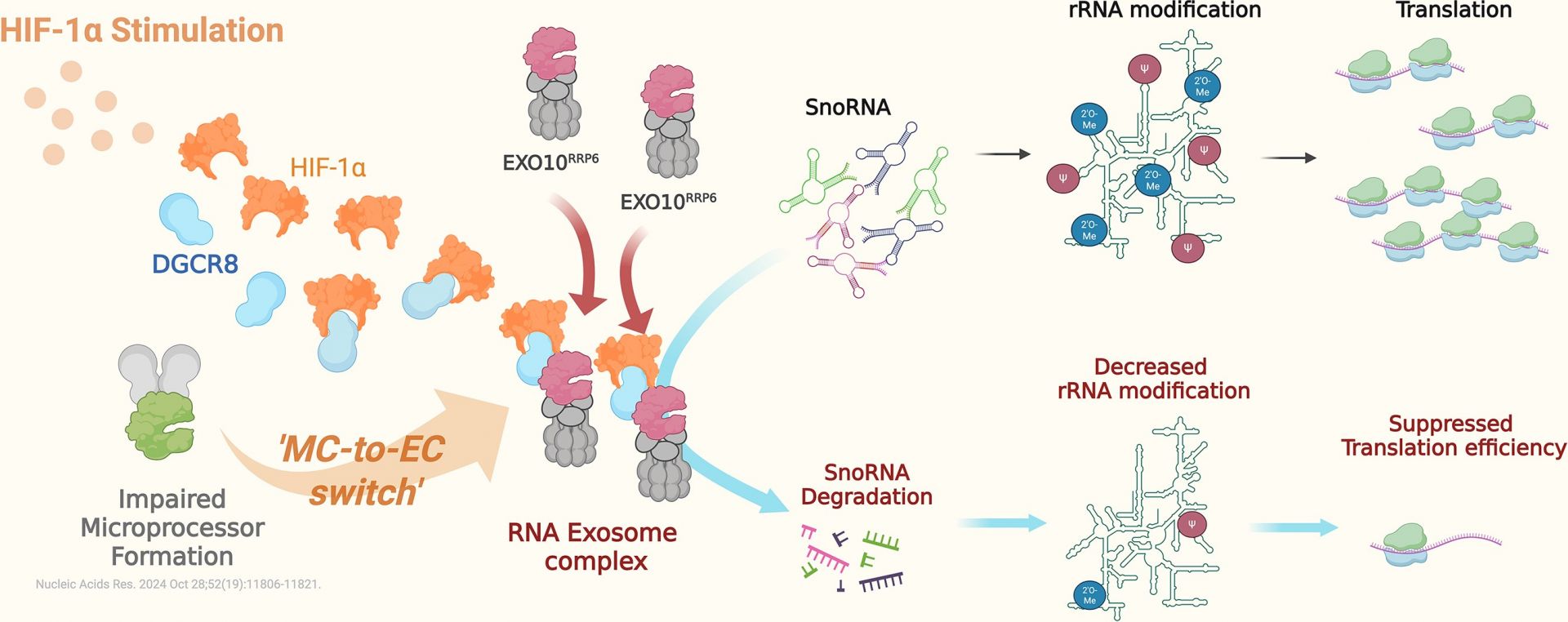 Dr. Chen's team has published a series of breakthrough research achievements. These include the 2018 discovery that HIF-1α non-transcriptionally inhibits Dicer to promote cancer metastasis (Journal of Clinical Investigation, 2018), and the 2024 finding that HIF-1α interferes with Microprocessor assembly to affect miRNA maturation in the nucleus (Nucleic Acids Research, 2024). Their latest breakthrough further decodes how HIF-1α "redirects" DGCR8 to the RNA exosome. Through the snoRNA-rRNA-protein translation axis, this assists cells in regulating energy expenditure under hypoxic conditions, providing critical scientific answers to how tumors adapt to environmental stress (Nucleic Acids Research, 2026).